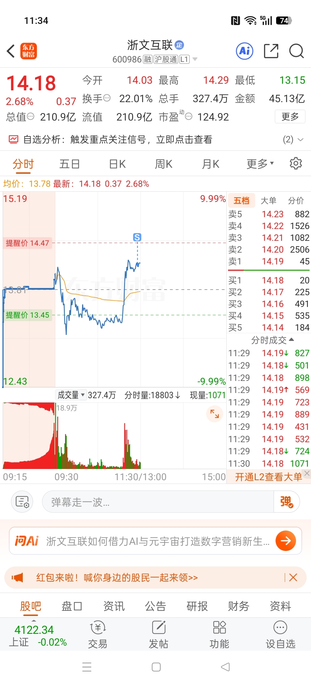 $浙文互联(SH600986)$ 前天就说了27号均价低吸点,今天下午有可能会爆拉,但均价还处于开盘价下面见好就收,能不能拉起来完全取决于跟风盘