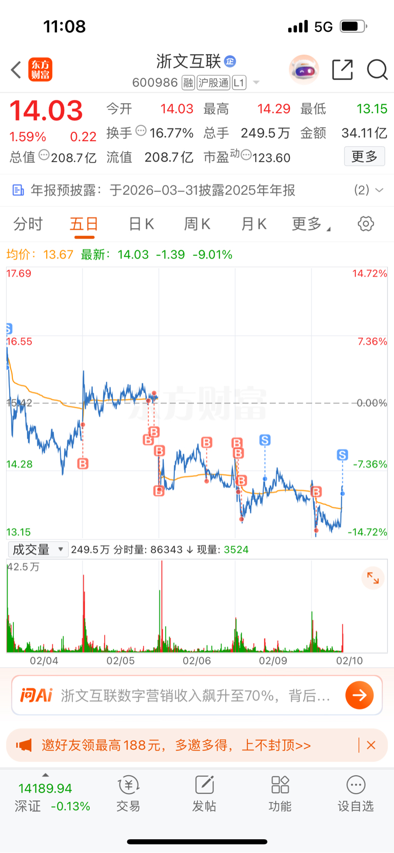 $浙文互联(SH600986)$ 今天又T早了
