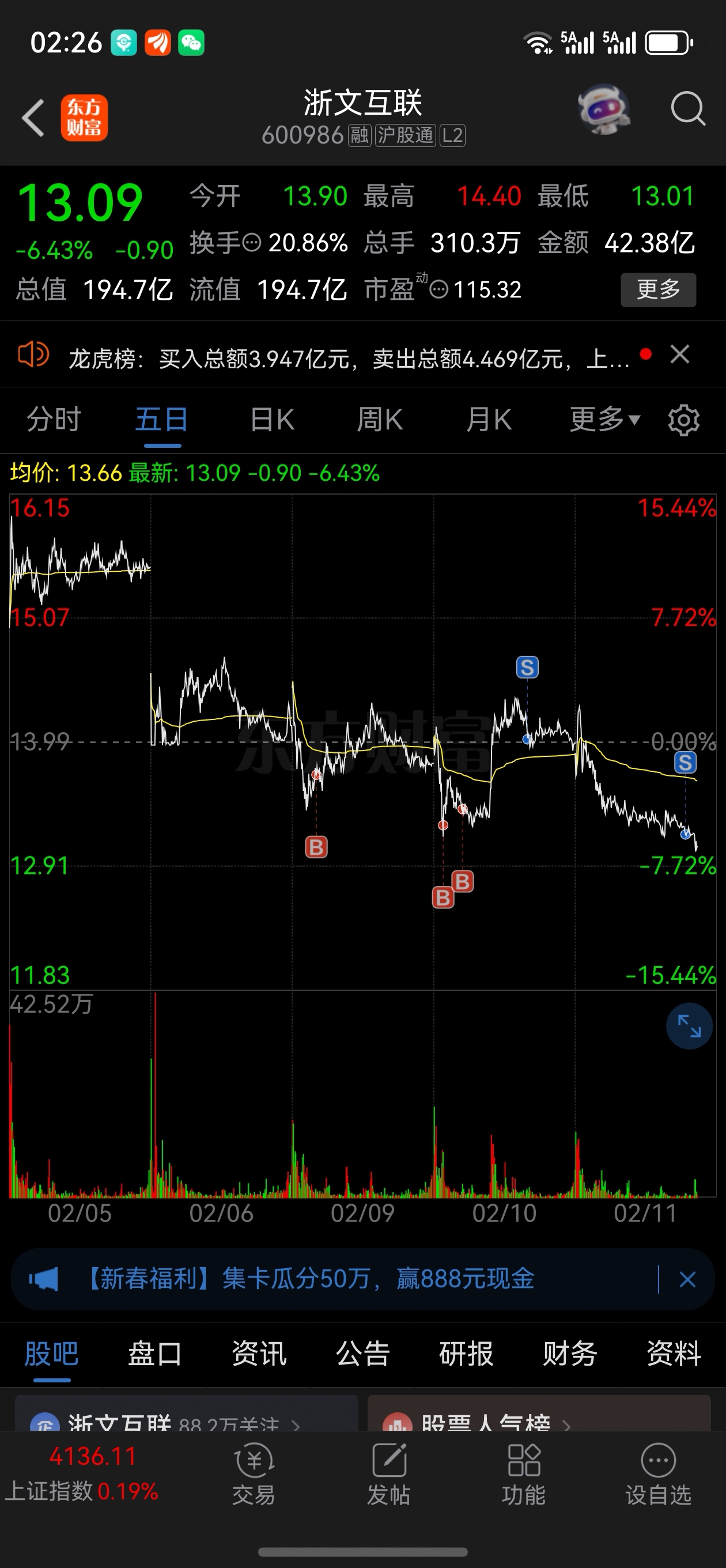 $浙文互联(SH600986)$ 早上冲高盈利2万没走,格局还剩1000走了,主力你赢了可以拉了