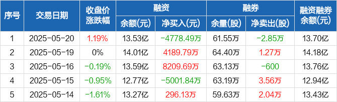 赤峰黄金:融资净偿还4778.49万元,融资余额13.53亿元(05-20)