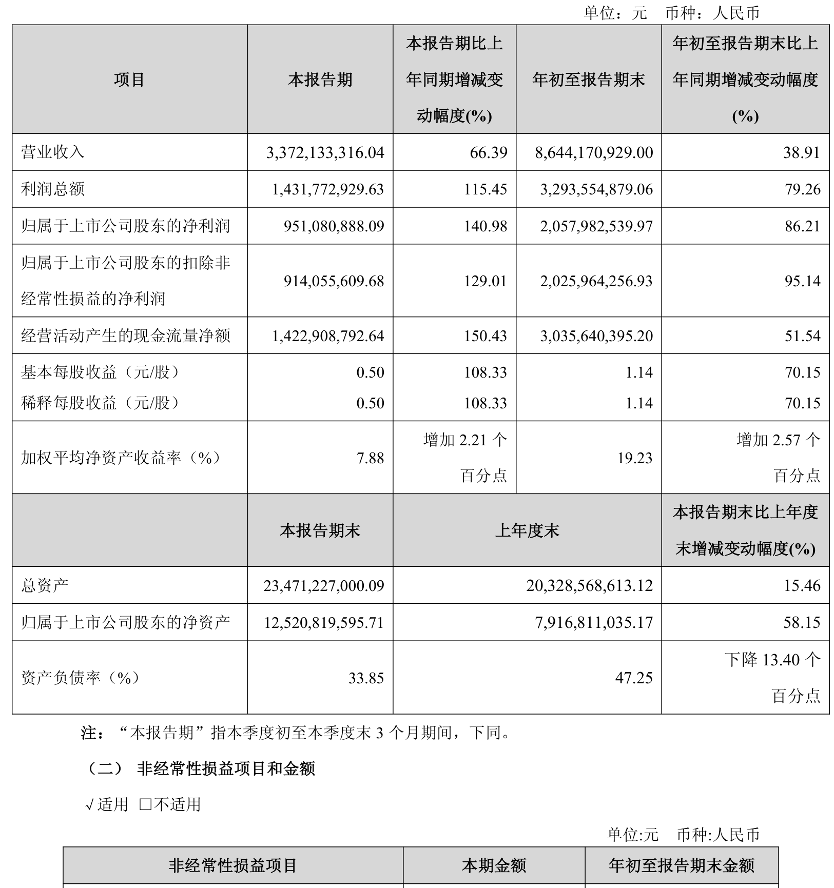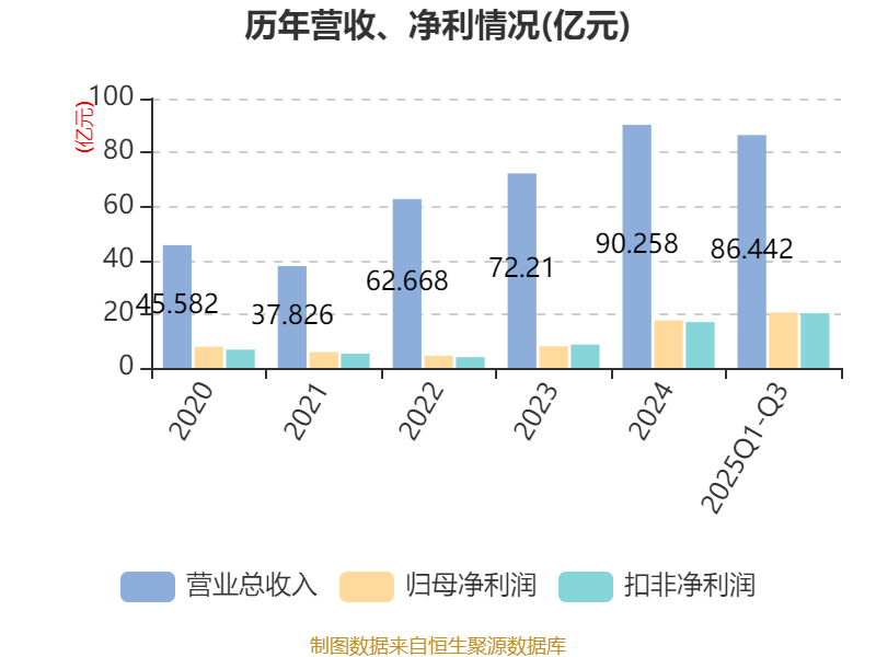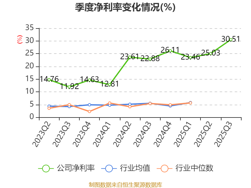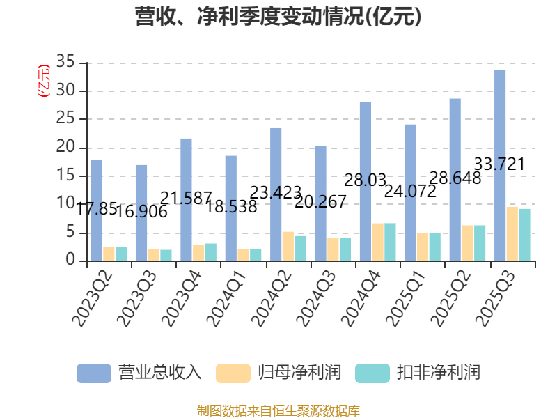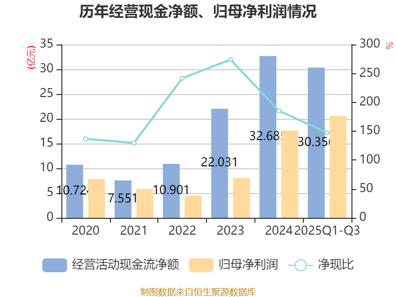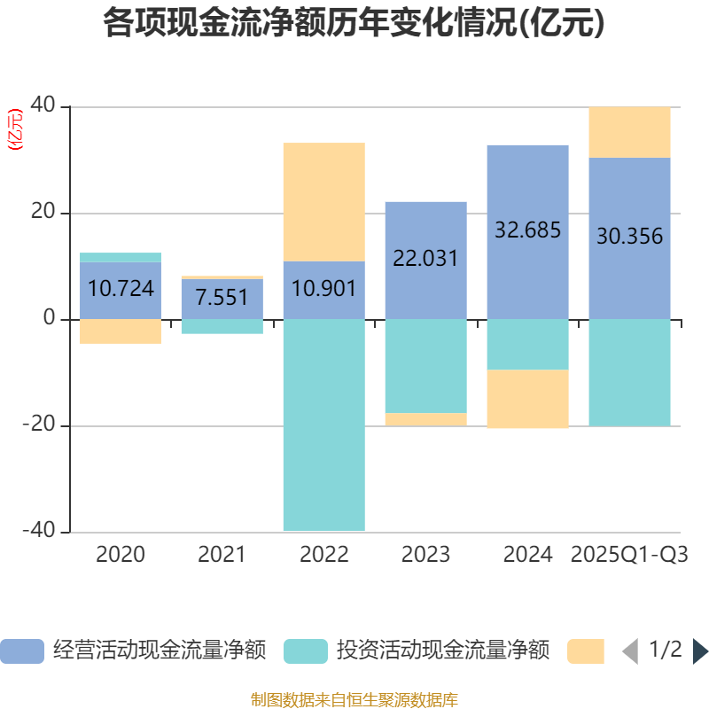 2025年前三季度,公司经营活动现金流净额为30.36亿元,同比增长51.54%;筹资活动现金流净额9.55亿元,同比增加15.35亿元;投资活动现金流净额-20.12亿元,上年同期为-6.09亿元。