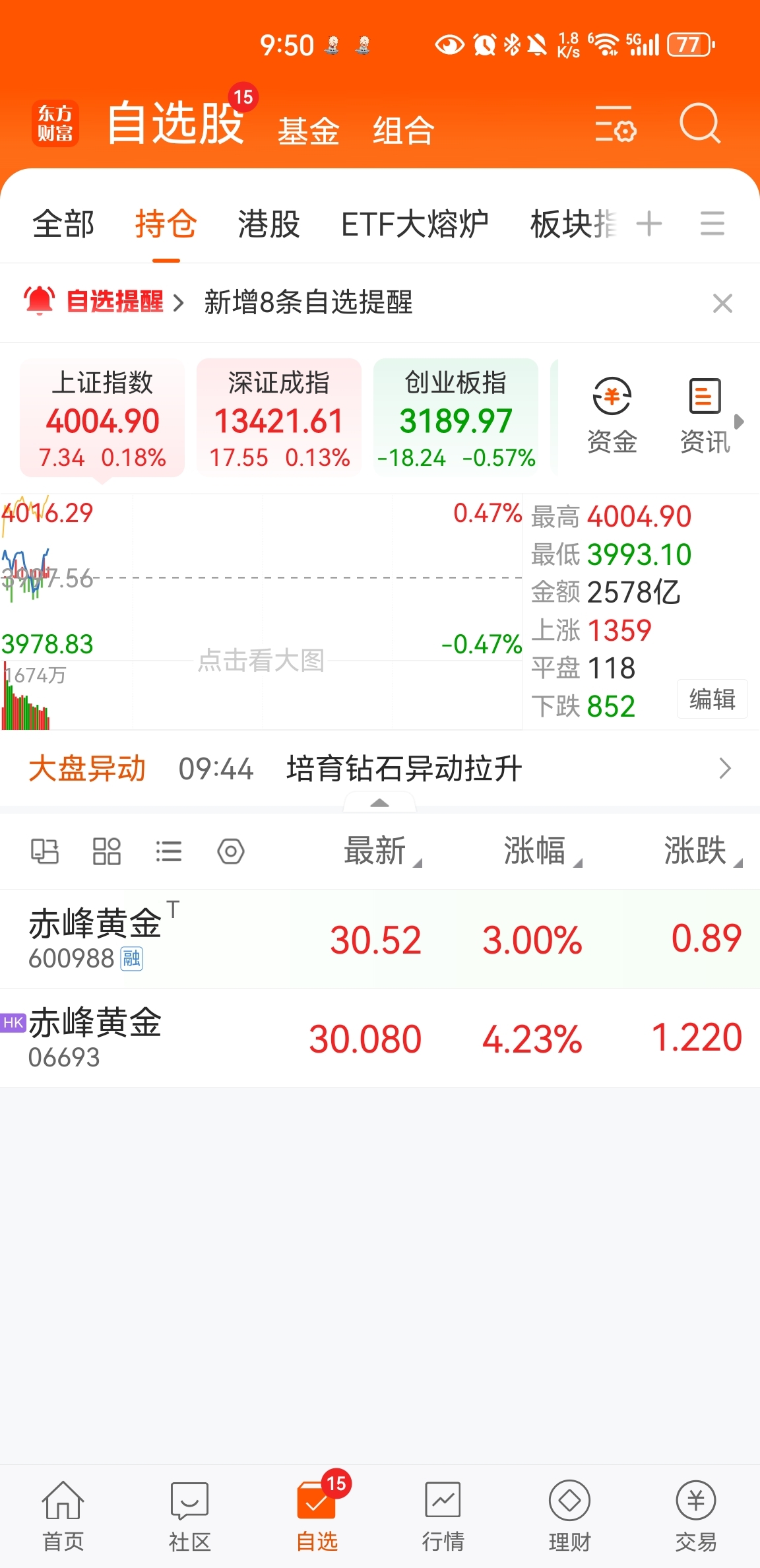 $赤峰黄金(SH600988)$ 赤金今天直接高开,有点意料之外呢!不过A的涨幅已经落后了,H还是涨幅不错嘛!继续努力!加油