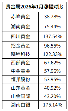 贵金属2026年1月涨幅对比