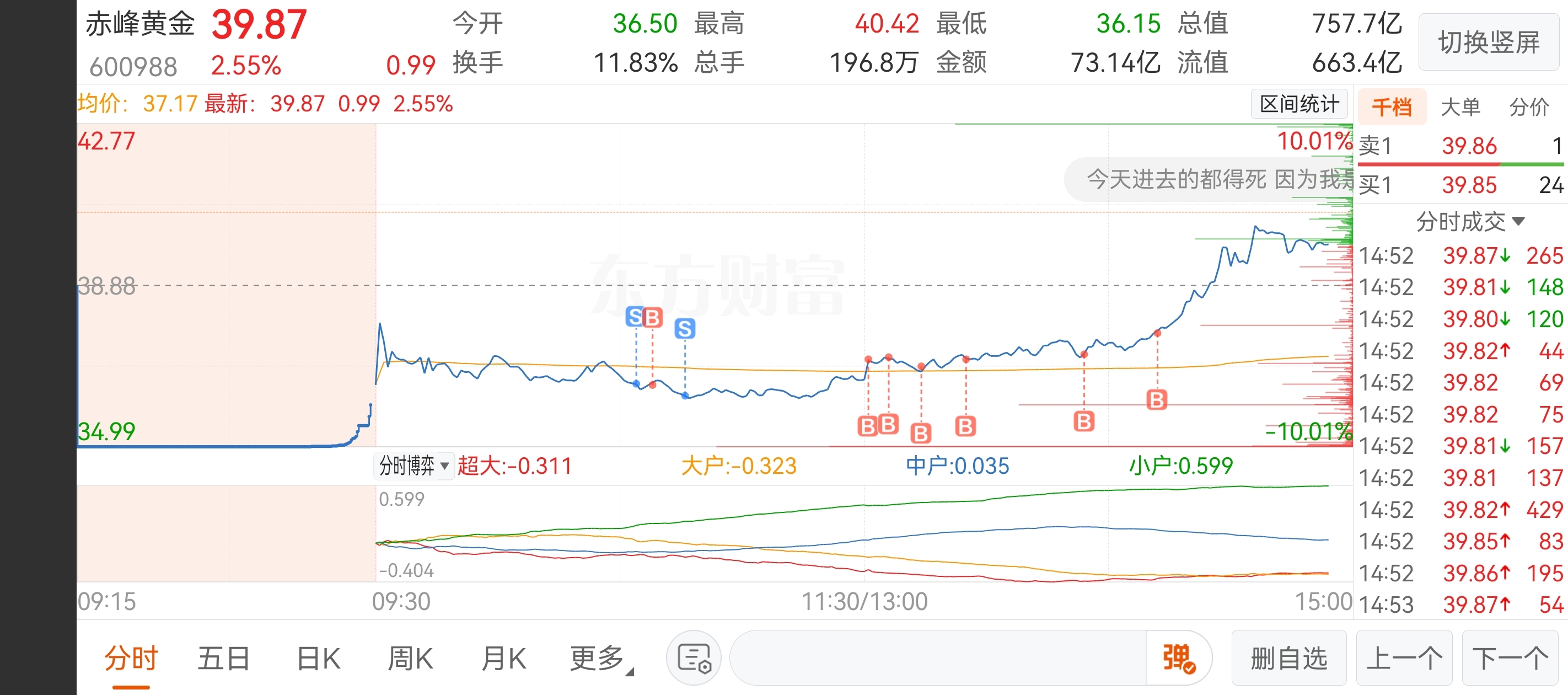 $赤峰黄金(SH600988)$ 今天本来清仓了,后面意识到自己操作错误,及时纠正翻倍买回来了