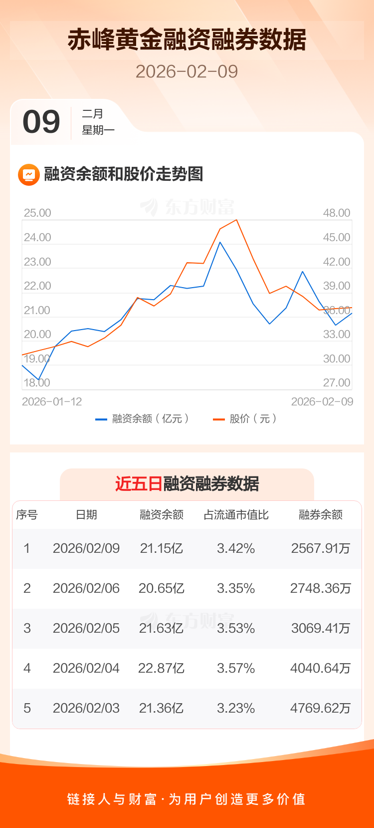交易所最新数据显示,赤峰黄金于2026年2月9日获融资买入2.65亿元,融资偿还2.15亿元,当日融资净买入4994.28万元。目前,该股融资余额21.15亿,占流通市值比例为3.42%。