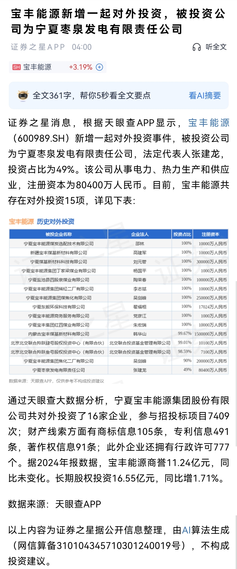 $宝丰能源(SH600989)$ 保疯真当进入电力行业,能赚钱,有资本的企业就是行,可以到处投资。