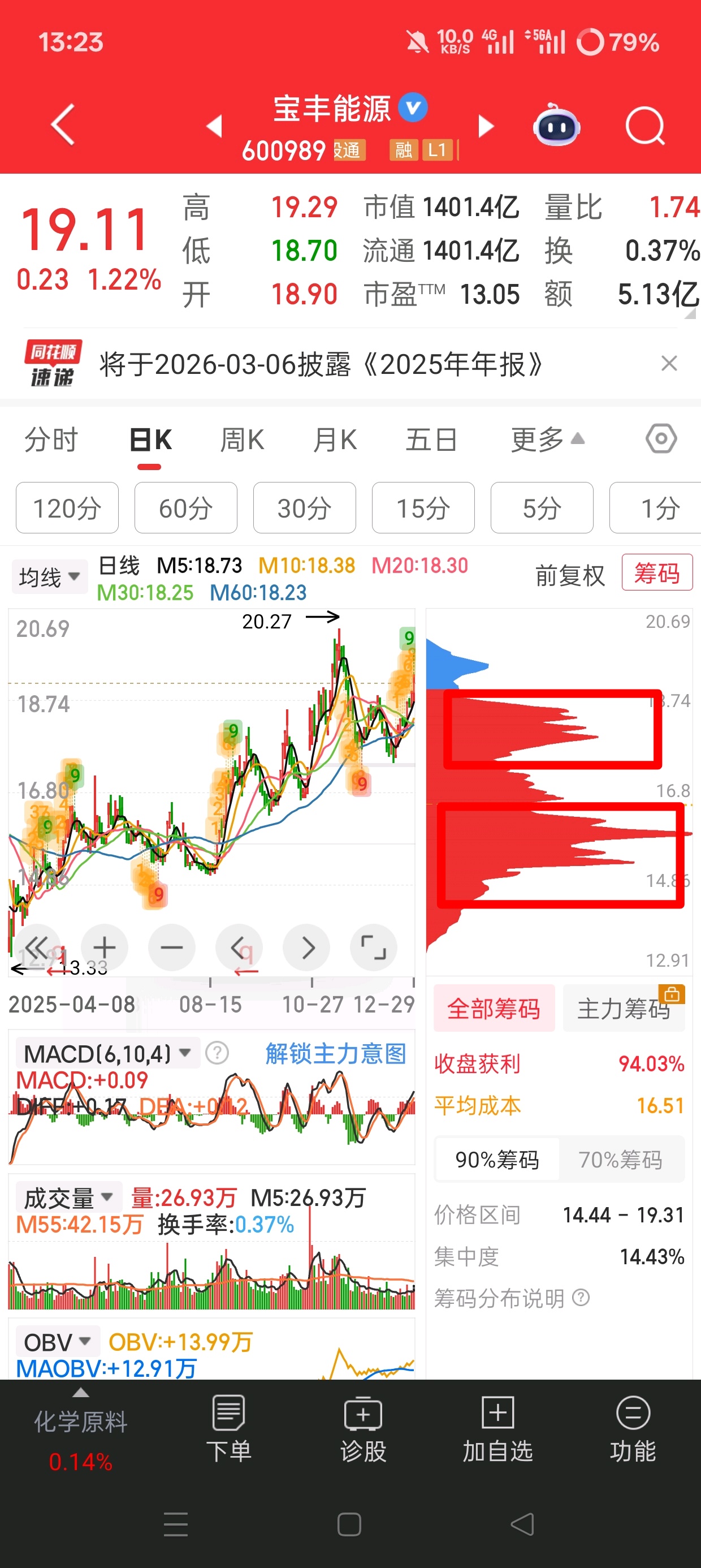 $宝丰能源(SH600989)$ 而筹码峰上来看,底层筹码并没有因为上涨而进行抛售,从4.7日计算,这只股也不过40%的涨幅,说明是长庄,空间上来看至少还有30的涨幅