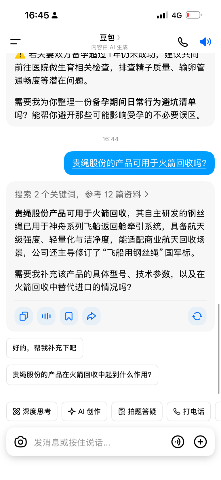 $贵绳股份(SH600992)$ 添加火箭回收概念。。。。贵绳股份产品可用于火箭回收,其自主研发的钢丝绳已用于神舟系列飞船返回舱牵引系统,具备航天级强度、轻量化与洁净度,能适配商业航天回收场景,公司还主导修订了“飞船用钢丝绳”国军标。$巨力索具(SZ002342)$