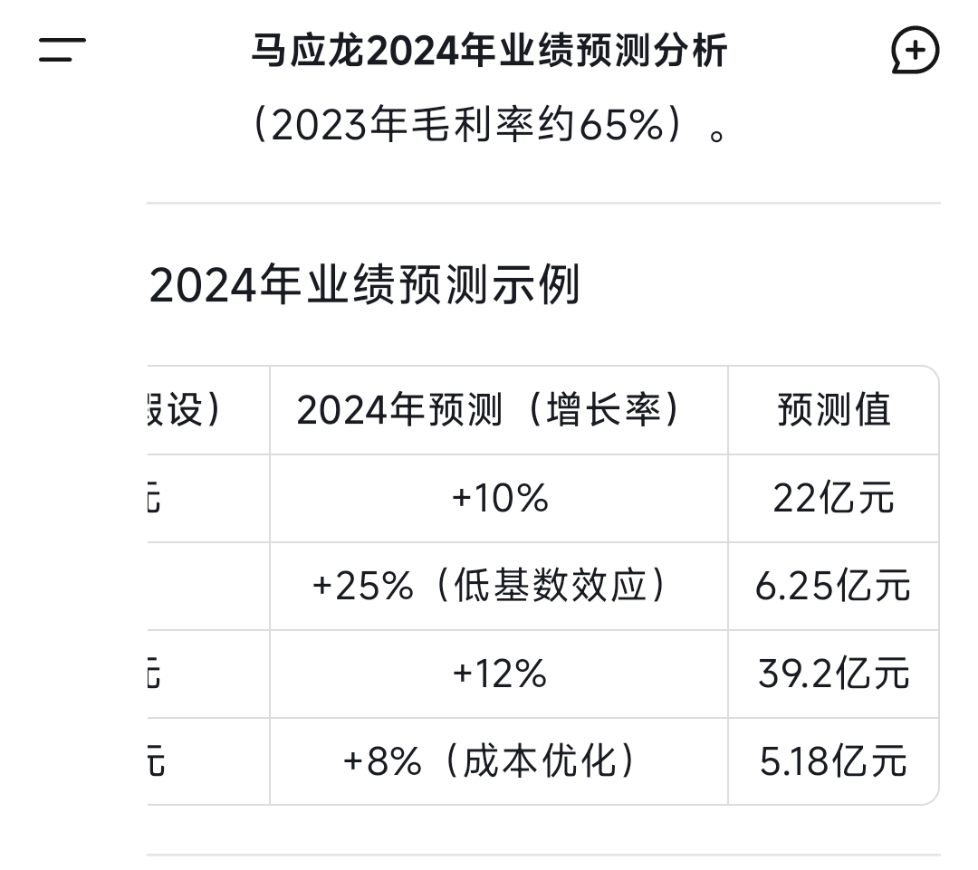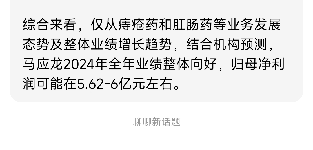 刚刚问了一下豆包和deepseek预测2024年马应龙业绩!豆包预测5.62-6亿,DS预测5.18亿,我预测5.4亿。
