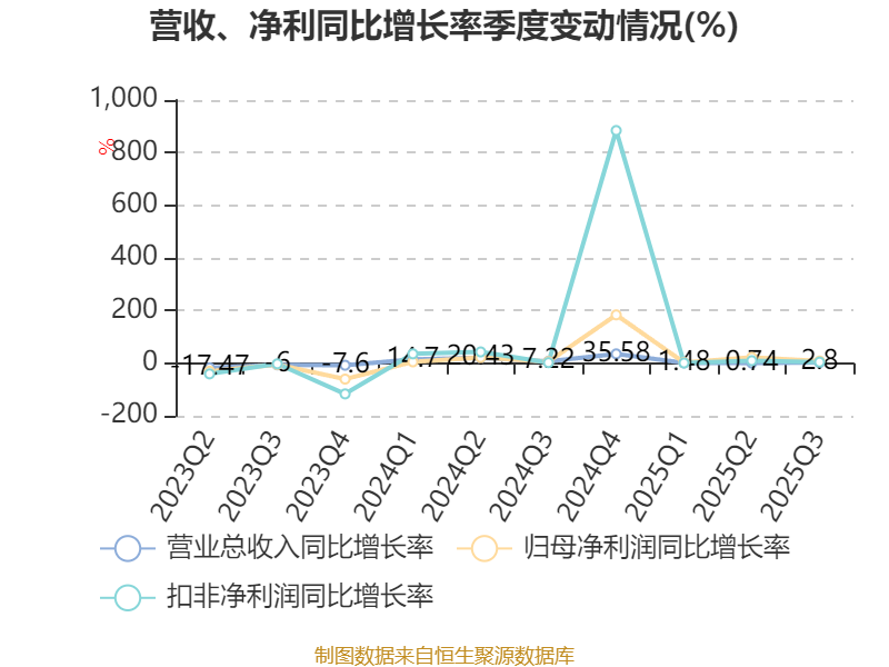 资产重大变化方面,截至2025年三季度末,公司货币资金较上年末减少48.9%,占公司总资产比重下降29.34个百分点;交易性金融资产合计较上年末增加679.27%,占公司总资产比重上升17.99个百分点;其他非流动资产较上年末增加8232.51%,占公司总资产比重上升7.08个百分点;在建工程合计较上年末减少90.86%,占公司总资产比重下降6.29个百分点。