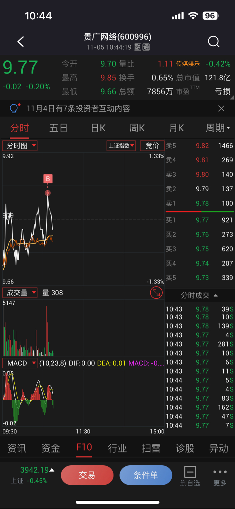 $贵广网络(SH600996)$ 几天前走了!今天回来以为你要飞了!买进就把我挂在山顶上!扶不起的阿斗!