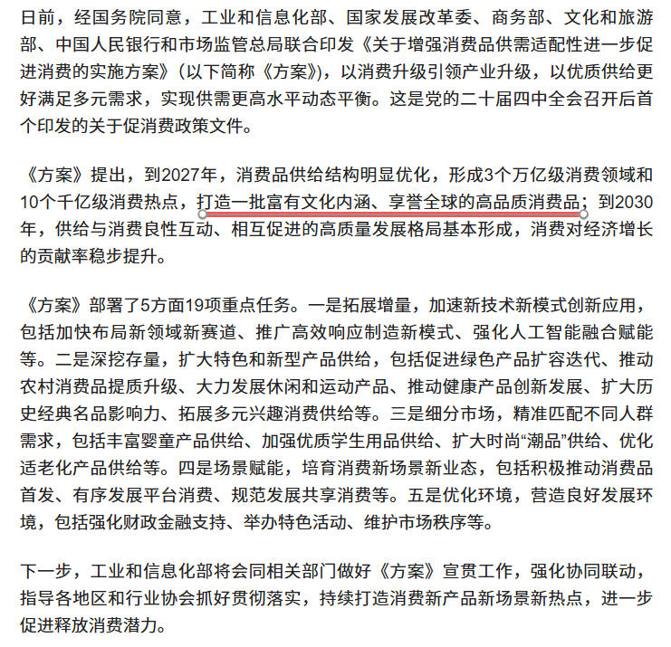 历史经典产业是指丝绸、茶叶、瓷器、酿酒、中药、文房四宝等文化底蕴深厚的中华传统特色产业,是中华文明的智慧结晶和民族瑰宝,积淀着劳动人民群众伟大创造力以及千百年来中华民族对美好生活的不懈追求。大力发展历史经典产业是扩大内需、提振消费、完善现代化产业体系的有效途径,是传承中华文明、增强文化自信的重要内容。为推动历史经典产业高质量发展,征求意见截止10月31日,静待指导意见发布时日。