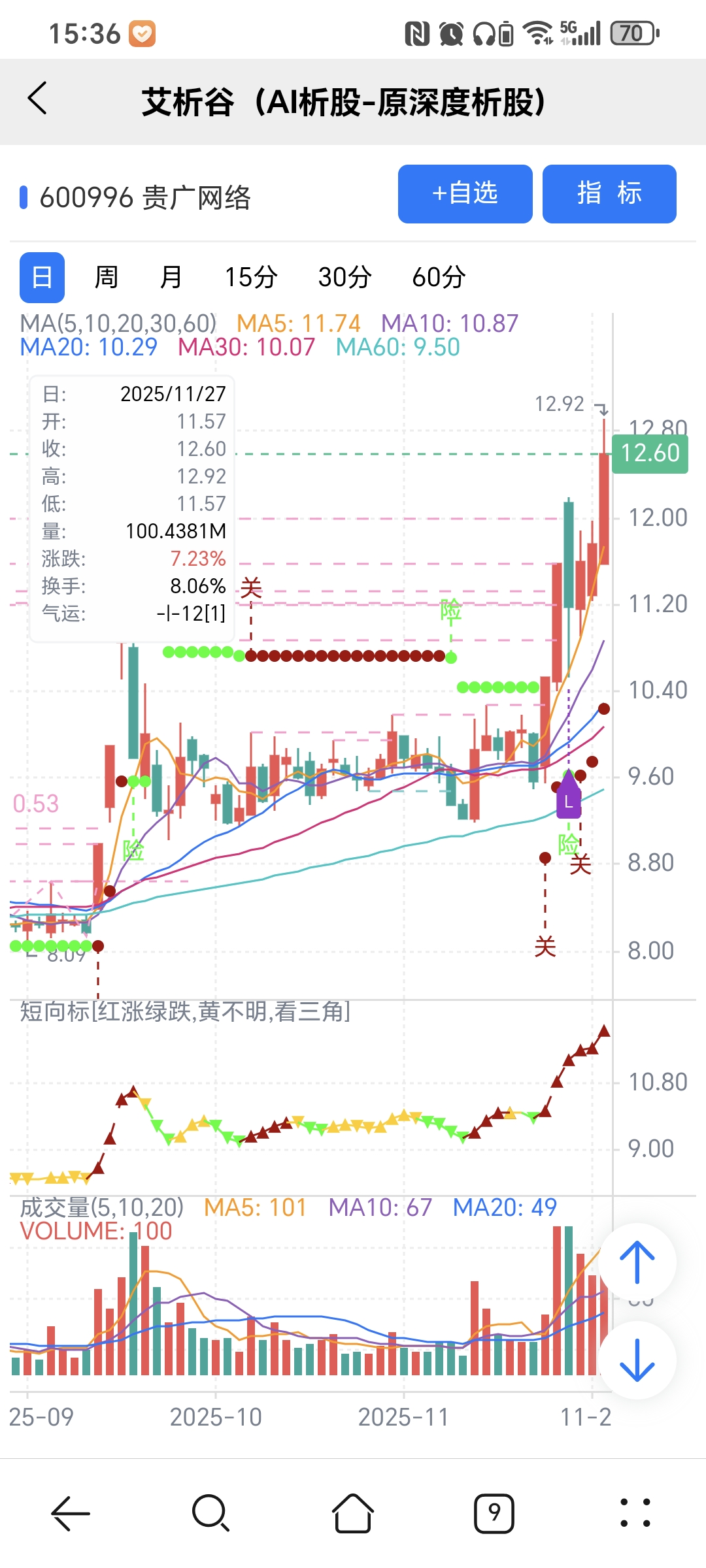 红绿小圆点是艾析谷的量化指标-超级短趋线,是趋势跟踪+突破类的量化指标,完全免费。
