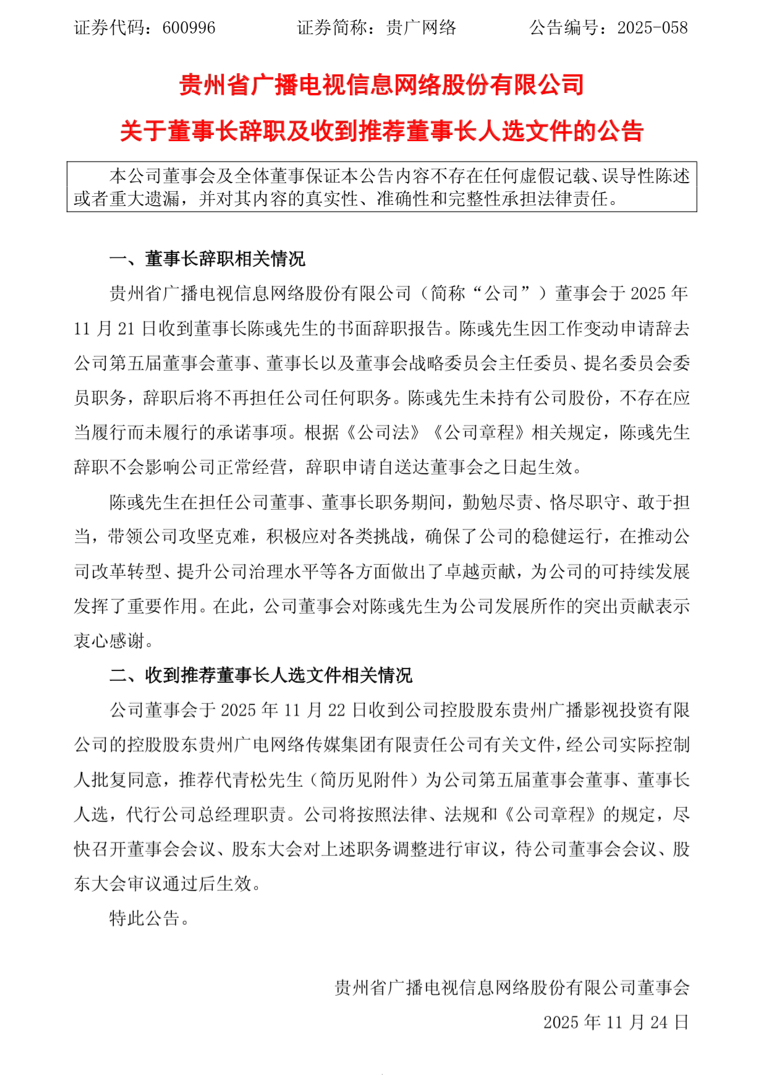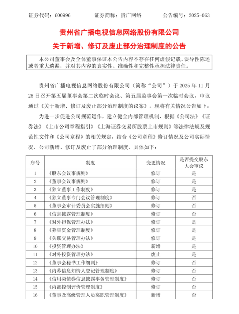 $贵广网络(SH600996)$ 换个角度来分析下昨晚的一堆公告。代青松董事长2025年11月22日上任至2025年11月29日公告新增、修订及废止了16项制度在短短的一周时间(工作日5天)工作效率如此之高吗?这算是新官上任第一把火吗?还是之前就已经在准备这些制度的优化调整?难道是之前陈彧董事长在辞职(11月21日)前谋划的?思考一下如此这般操作究竟是何人所为呢???!!!