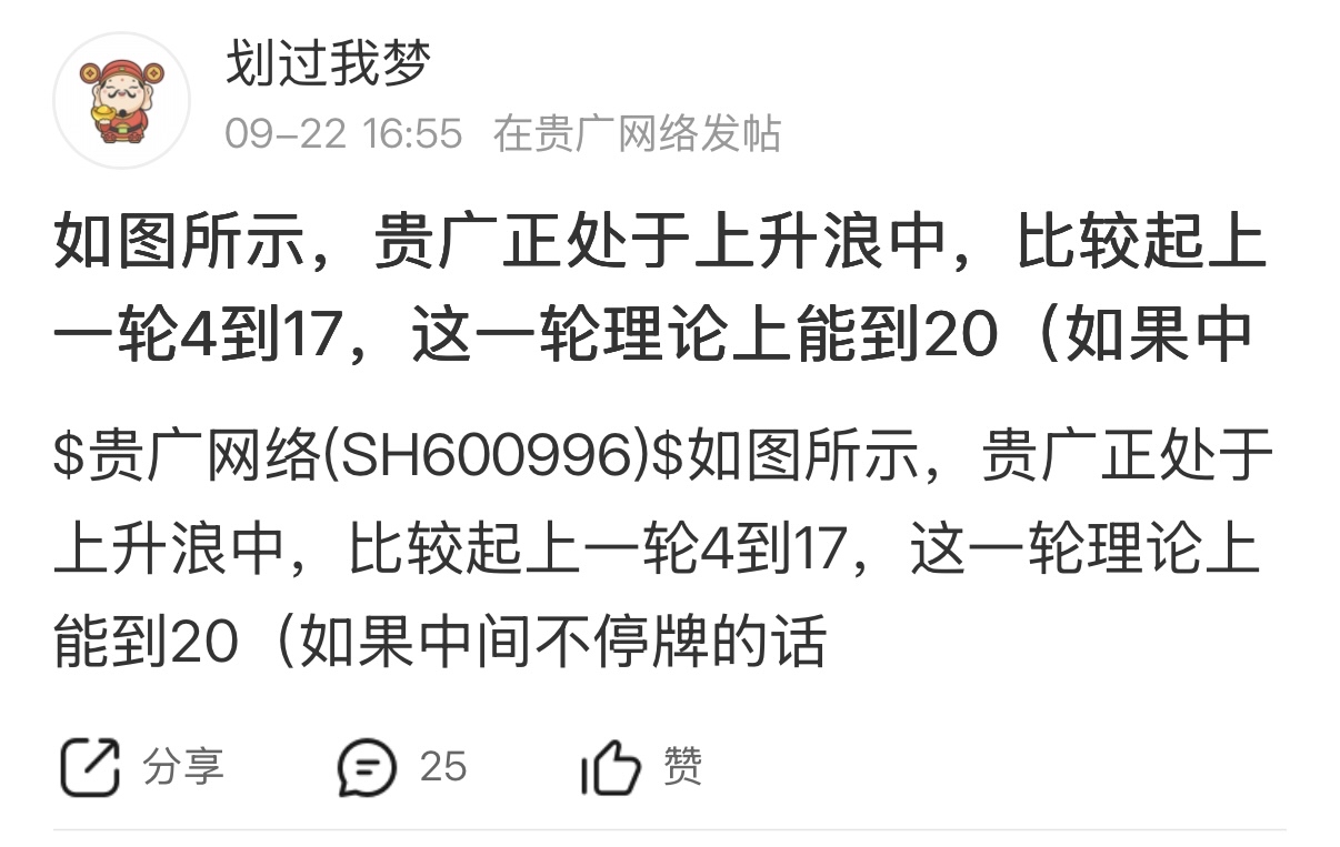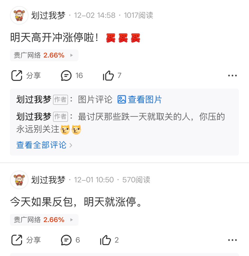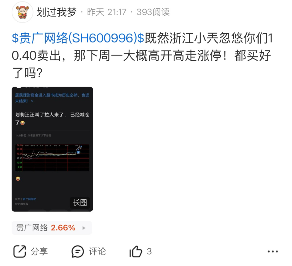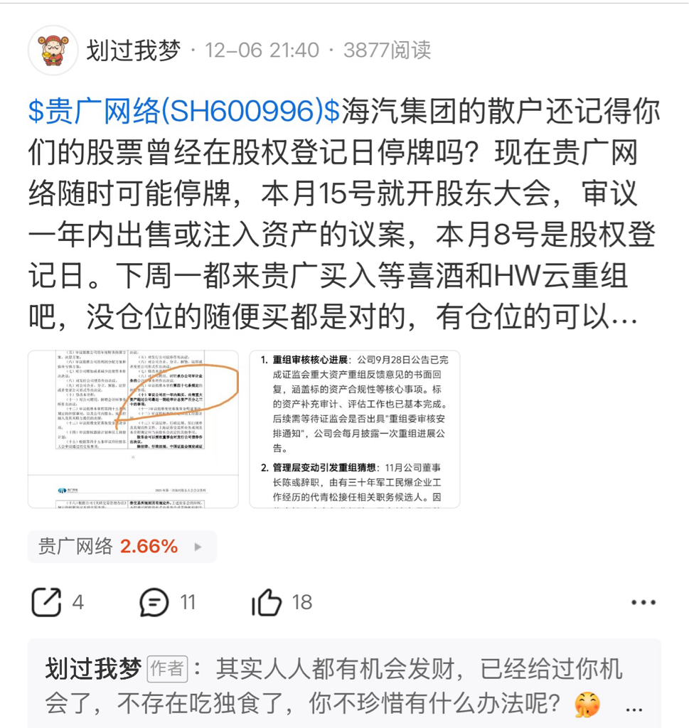 $贵广网络(SH600996)$ 划过我梦简称划狗,就是一个扰乱市场行为的大sb,时不时就来造谣,一会儿要涨停了,一会儿要上17了,一会儿临时股东大会要停牌了,一会儿股权登记日要停牌了,天天打胡乱说,停牌了吗?涨停了吗,gua娃子一个!被人反驳就把人家拉黑,被啪啪打脸还不敢当!
