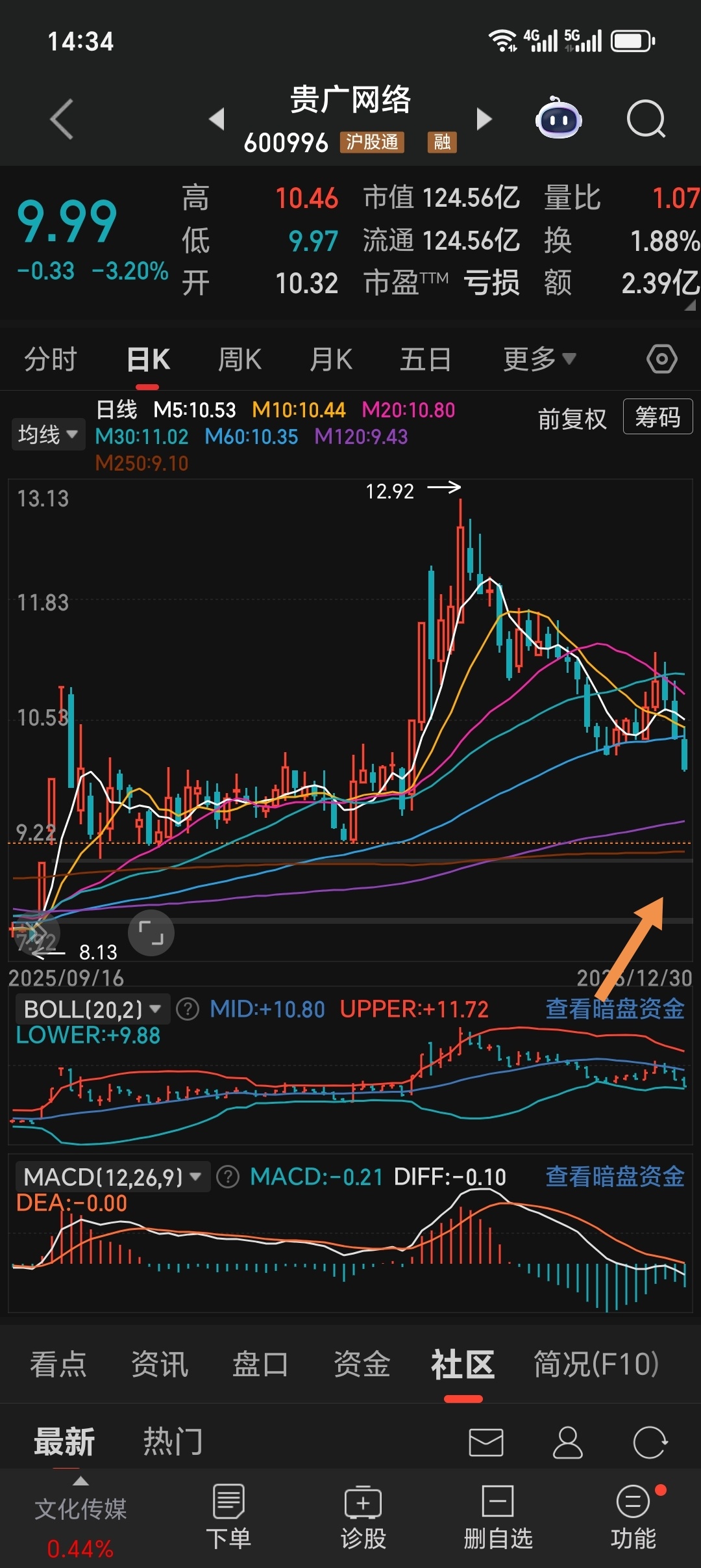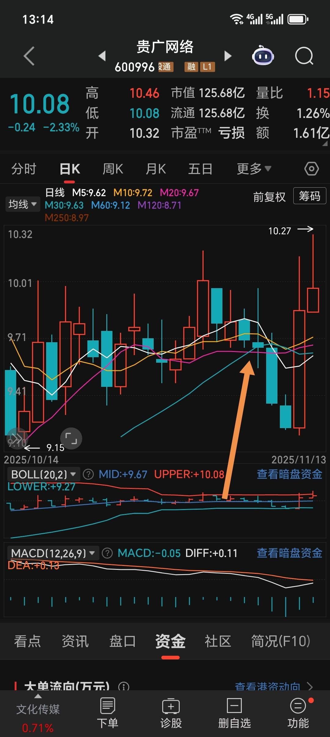 $贵广网络(SH600996)$ 想当初这里的时候,空狗也在喊破位破位!却不见已经底背离,不见快要触破布林线下轨反弹。