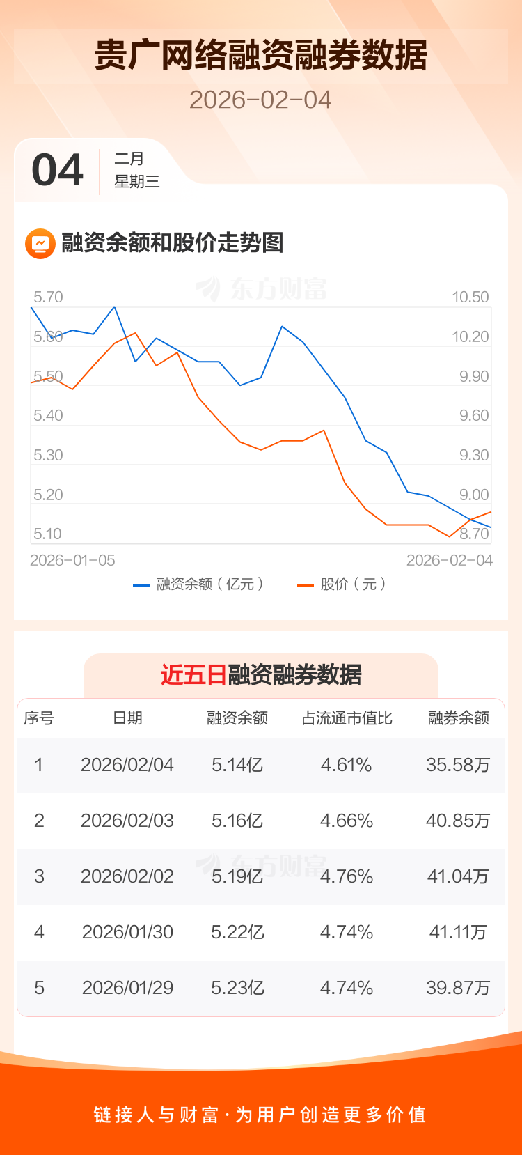 交易所最新数据显示,贵广网络于2026年2月4日获融资买入995.77万元,融资偿还1153.51万元,当日融资净偿还157.74万元。目前,该股融资余额5.14亿,占流通市值比例为4.61%。