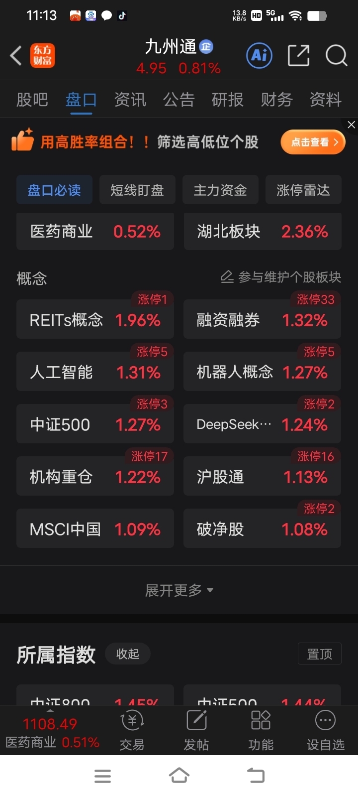 $九州通(SH600998)$ 破净涨1.08%中证500涨1.27%湖北涨2.07%你都是的