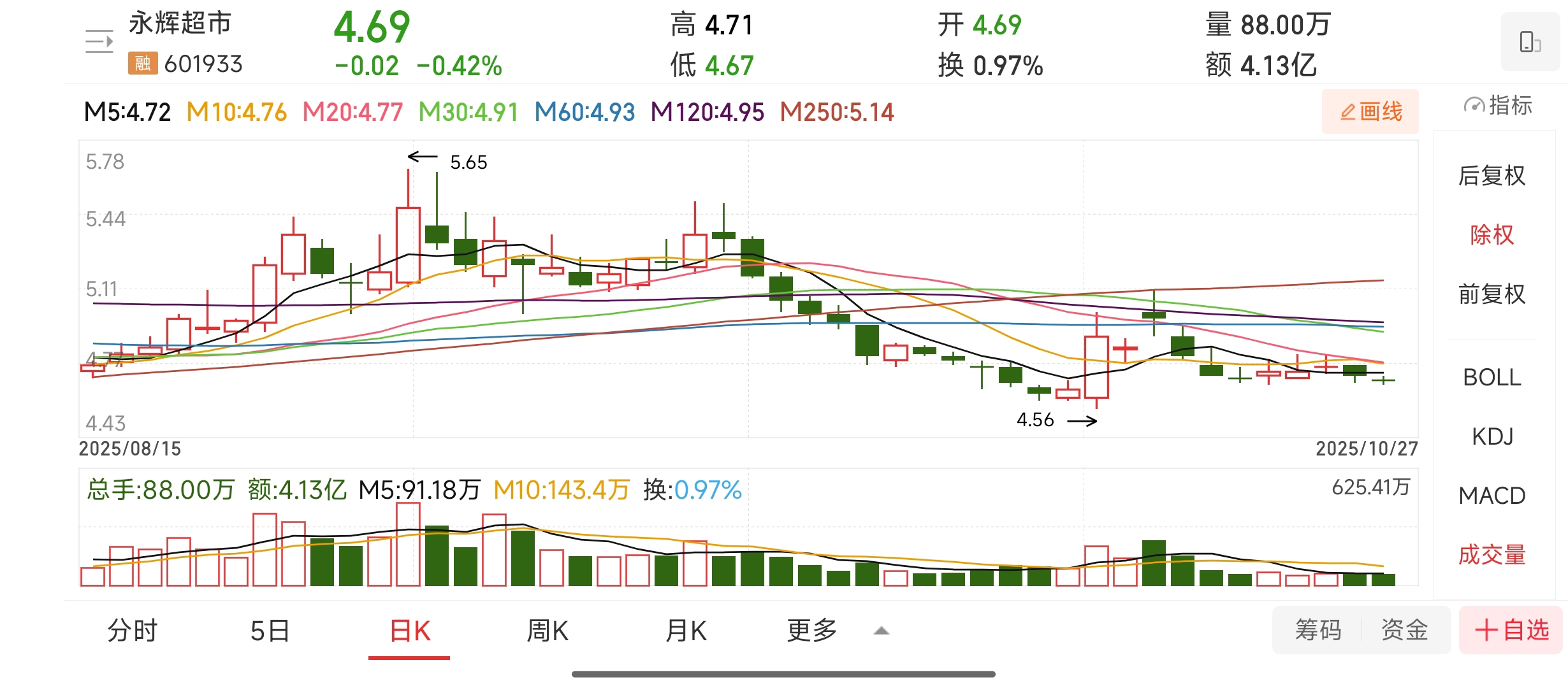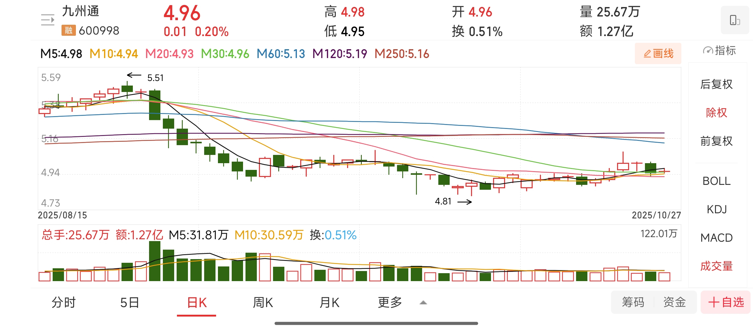 看走势:从8月的5.51元一路往下调,近期跌到4.81元附近,是典型的“下跌后低位”。