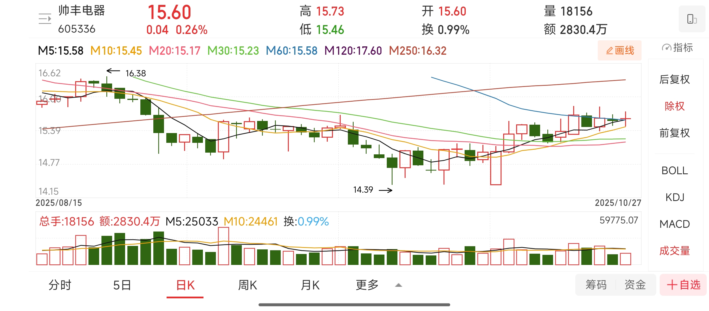 从8月的16.38元调整到近期的14.39元,属于下跌后的低位区间。