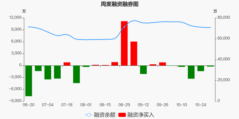 九州通本周(2025/10/27-2025/10/31)累计涨幅达3.03%,截至10月31日最新股价报收5.10元。从增量上来看,10月27日至10月31日融资买入交易规模1.15亿元,融资偿还规模1.17亿元,期内融资净偿还279.14万元。从存量上来看,截止11月2日,九州通融资融券余额7.14亿元,其中融资余额规模7.07亿元,融券余额规模635.07万元。