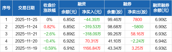 融资方面,当日融资买入595.99万元,融资偿还640.38万元,融资净偿还44.39万元,连续3日净偿还累计682.01万元。融券方面,融券卖出1.23万股,融券偿还4500股,融券余量99.46万股,融券余额488.36万元。融资融券余额合计6.9亿元。