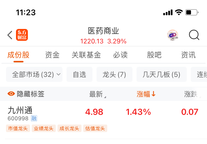 $九州通(SH600998)$ 铁铁 板块三个点了,你不是板块龙头吗