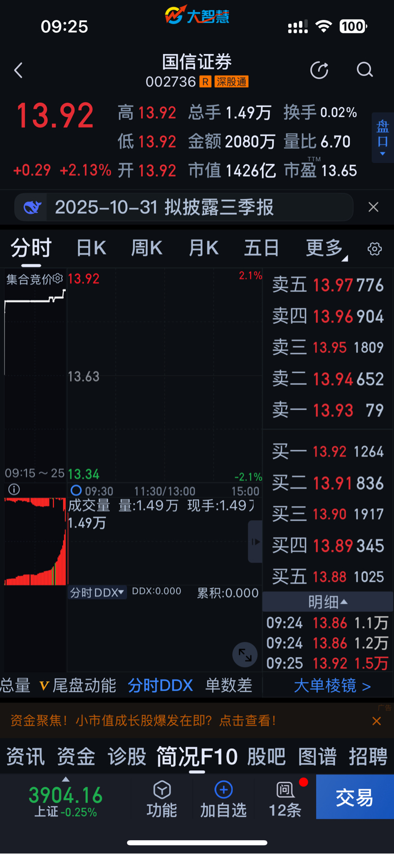 $招商证券(SH600999)$ 招妹啊!国信一个高开,市值差点就把你超了,丑不丑?还是深圳排名第一的上市券商,可能今天收盘就不是了