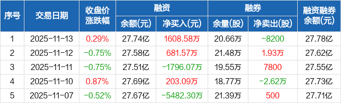 招商证券:融资净买入1608.58万元,融资余额27.74亿元(11-13)