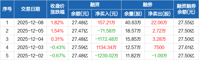 招商证券:融资净买入157.21万元,融资余额27.48亿元(12-08)