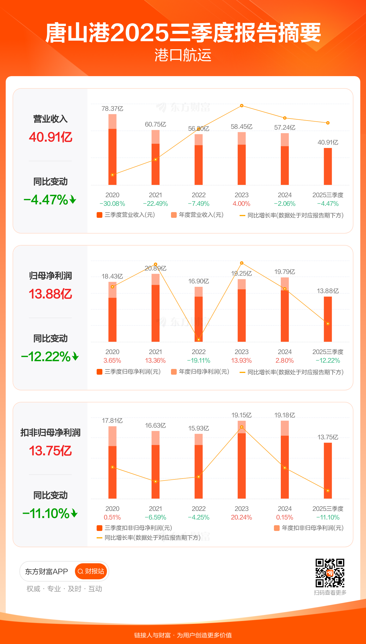 唐山港10月30日发布2025年三季报显示,公司前三季实现营业收入40.91亿元,同比下滑4.47%;归母净利润13.88亿元,同比下滑12.22%;扣非归母净利润13.75亿元,同比下滑11.10%。