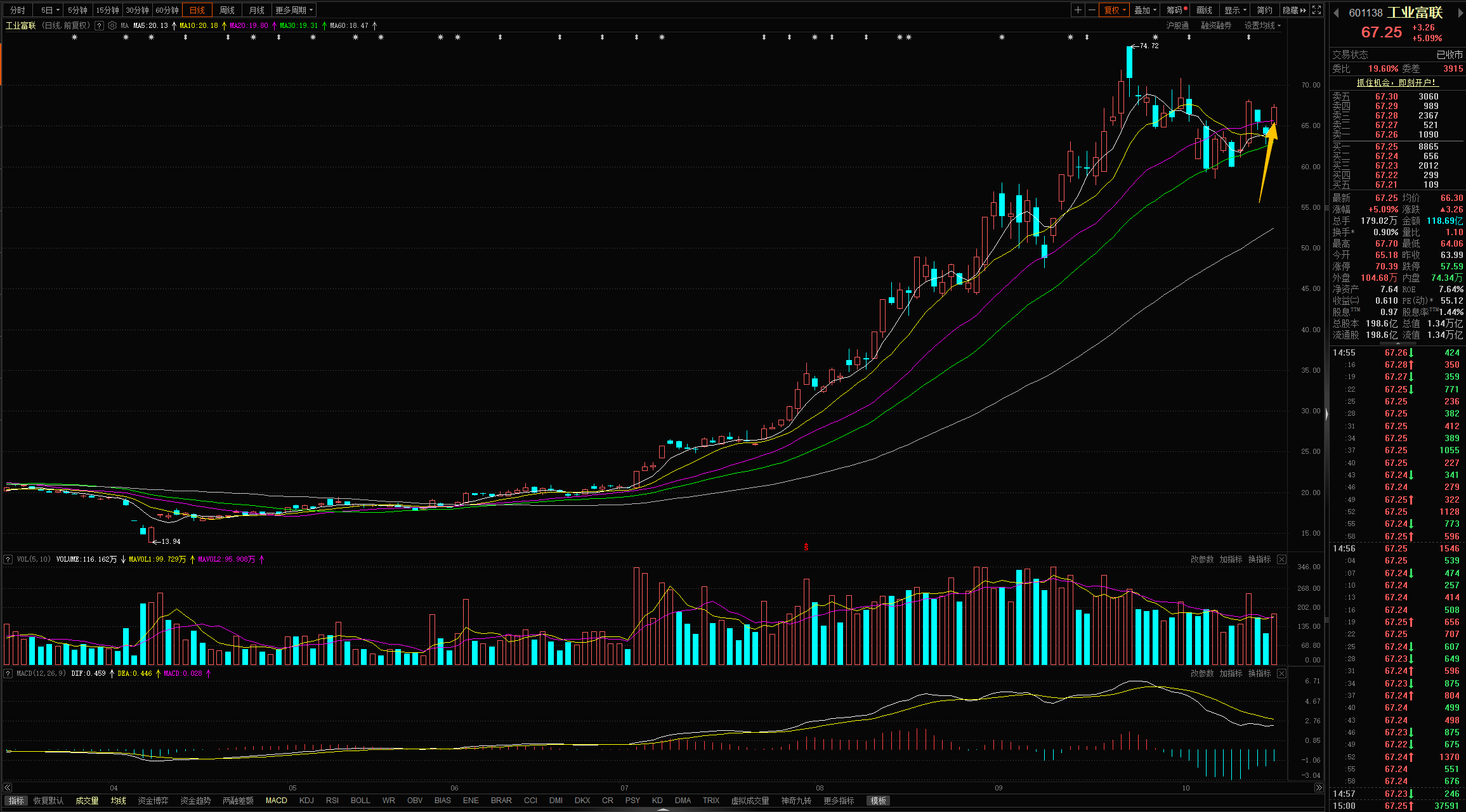 随着节后回来突破了七月份的高点,走势出现结构调整。上周五依托5日均线向上涨停,形态上呈现进攻态势,不过当前要说空间打开还为时尚早,收在了23.25并未突破,所以今天如果能够高开,回踩不跌破转弱的话,才能进一步打开上行空间,到时候才合适上去搭便机。