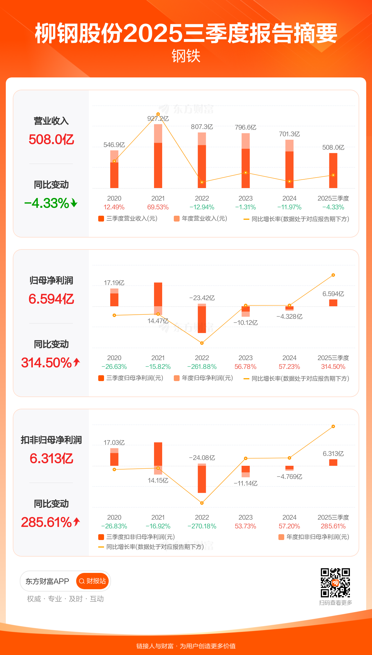 柳钢股份10月30日发布2025年三季报显示,公司前三季实现营业收入507.98亿元,同比下滑4.33%;归母净利润6.59亿元,同比增长314.50%;扣非归母净利润6.31亿元,同比增长285.61%。
