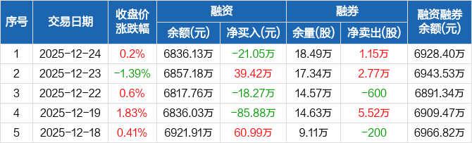 柳钢股份:融资净偿还21.05万元,融资余额6836.13万元(12-24)