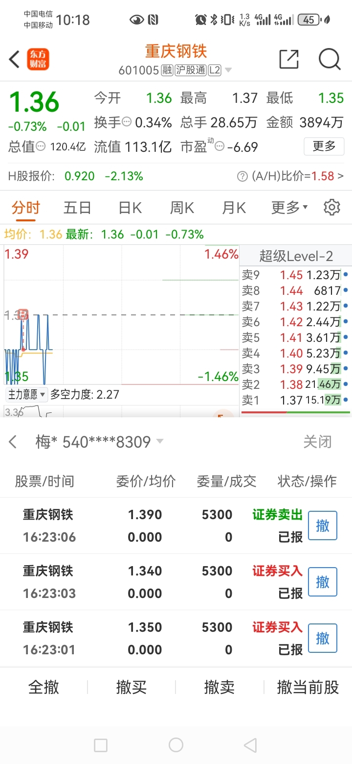 $重庆钢铁(SH601005)$ 今天1.35和1.34坚决不撤单。