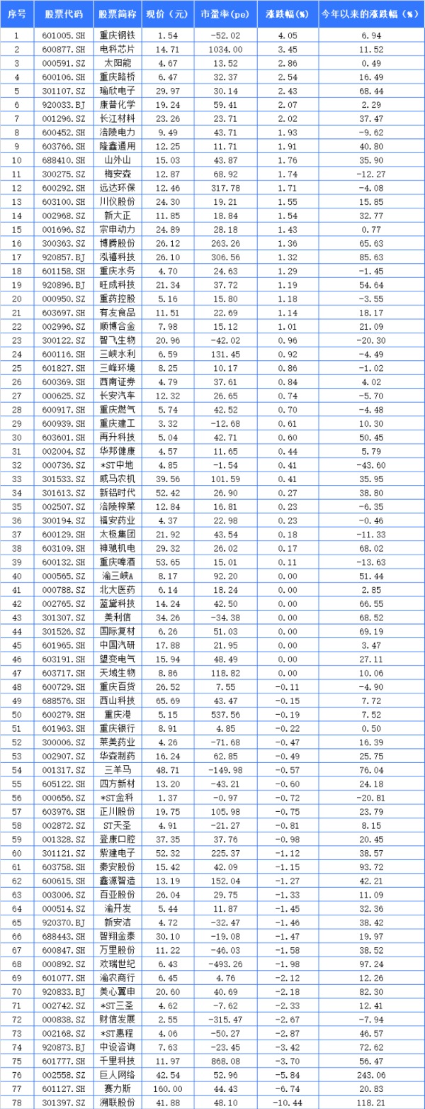数据显示,重庆钢铁以上涨4.05%位居第一,电科芯片以上涨3.45%列涨幅第二,太阳能以上涨2.86%列涨幅第三。