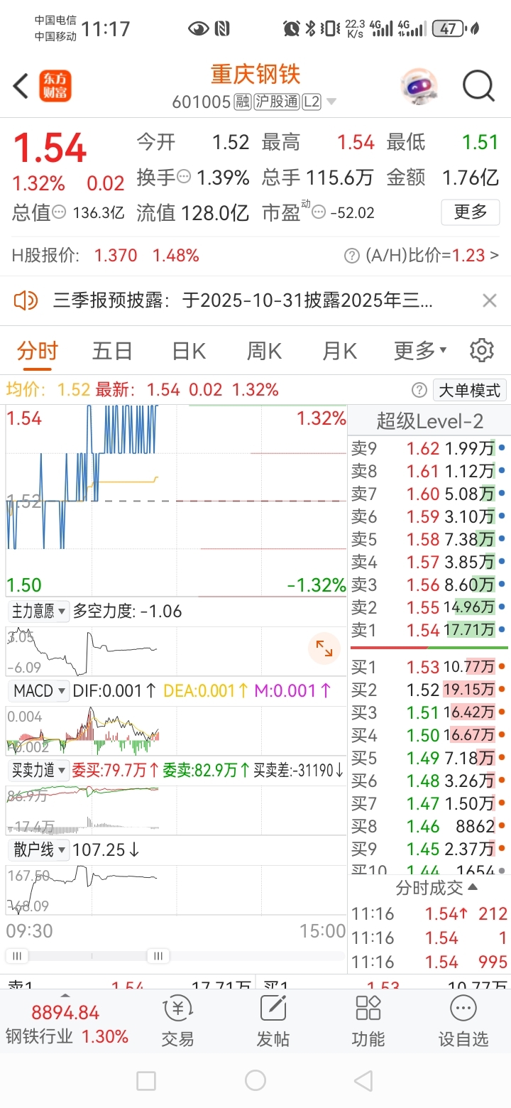 今天重钢依旧没有操作,当天重钢每涨一分,就买2千块高股息。