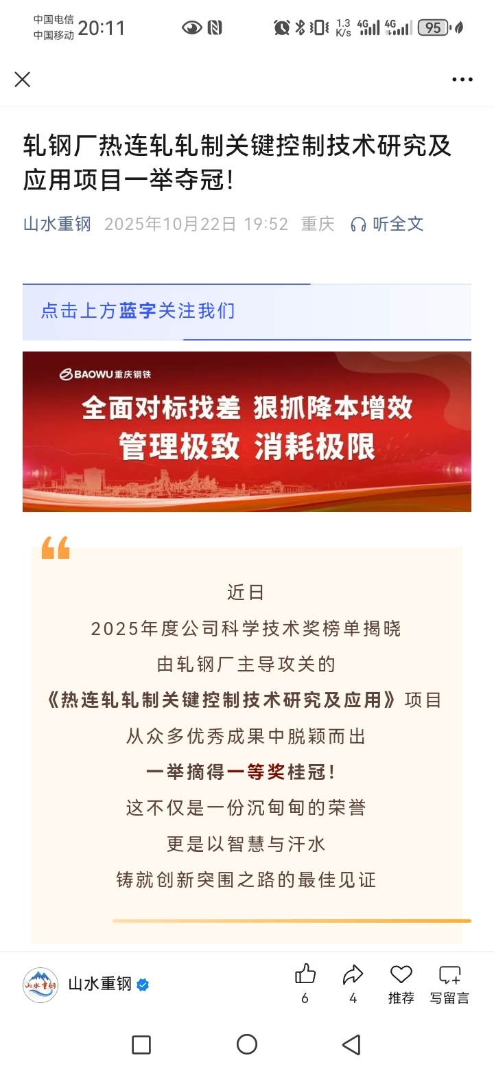 $重庆钢铁(SH601005)$ 重磅利好!重钢获得科技一等奖!!!