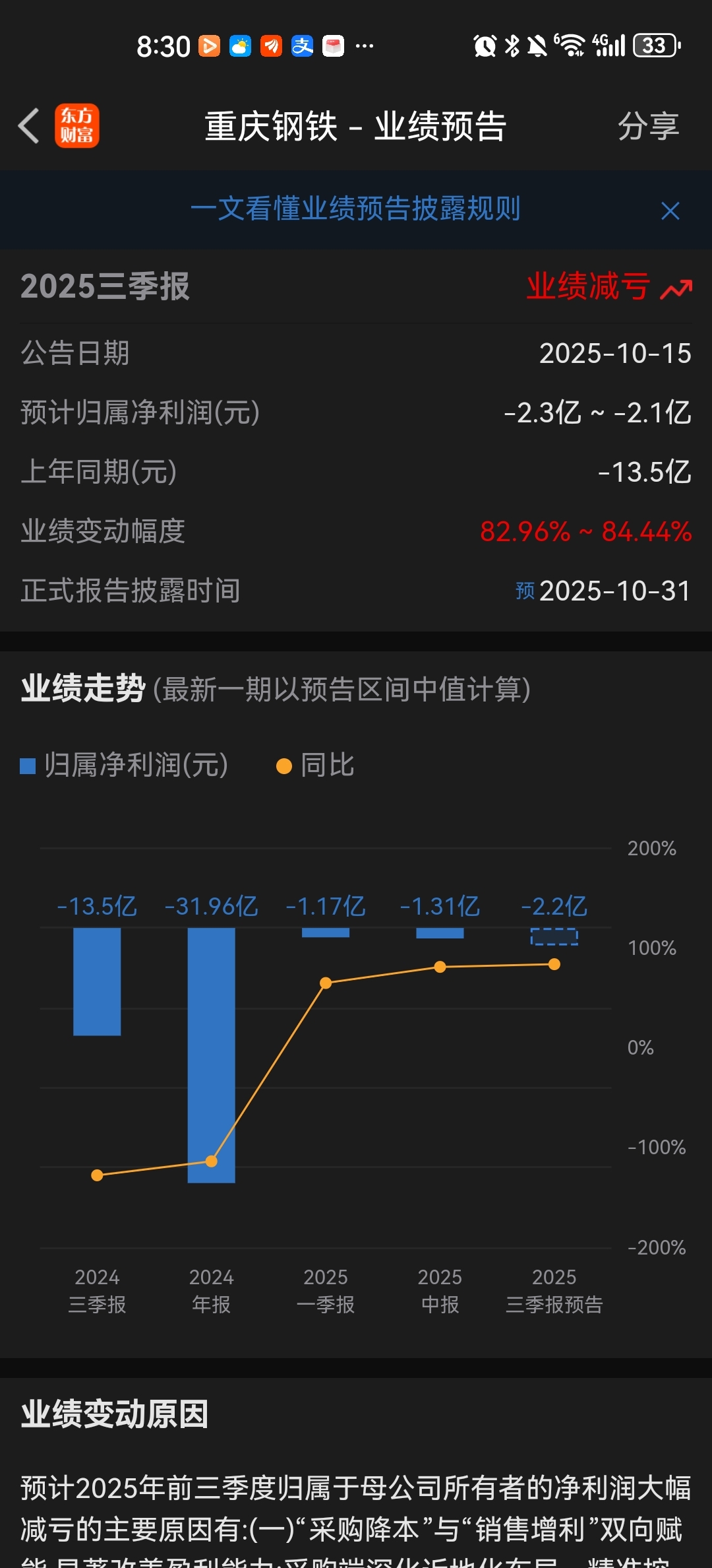 $重庆钢铁(SH601005)$ 业绩减亏,第三季度亏损8千万到1亿