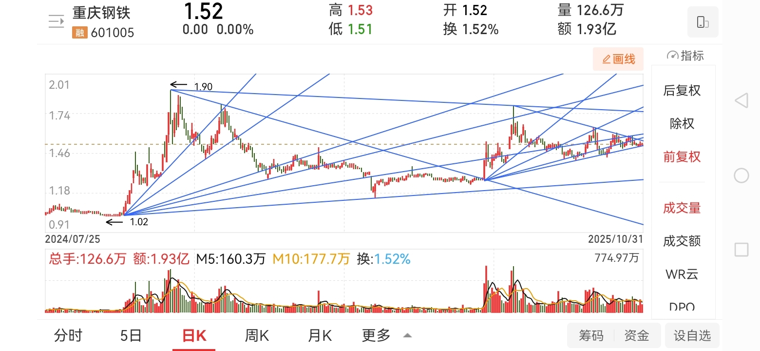 $重庆钢铁(SH601005)$ 三角收敛区域末端极限位置,预计三个交易日选择方向。我还是觉得会回踩半年线和年线位置1.43。