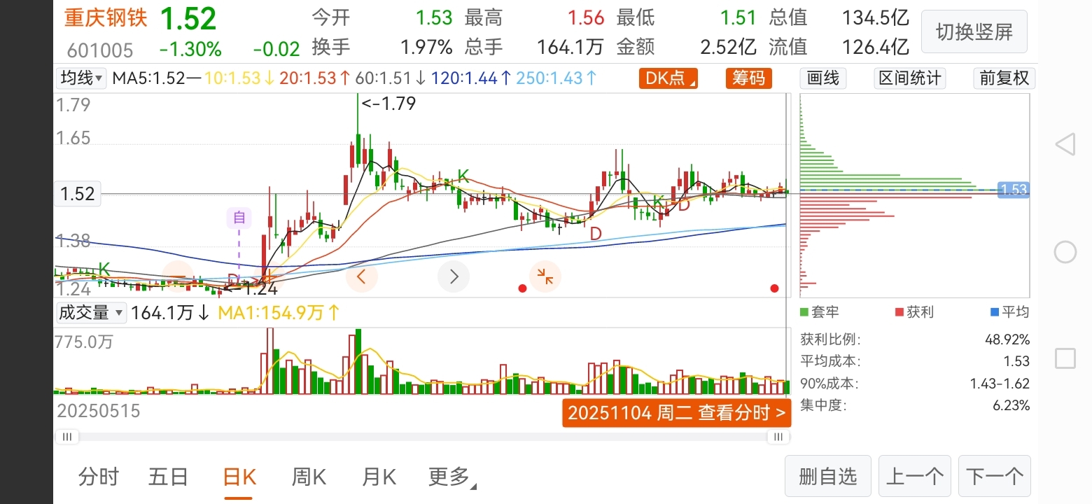 $重庆钢铁(SH601005)$ 今天筹码峰出现轻微松动,应该有人走了,明天第一支撑位1.5,第二支撑位1.48,第三支撑位1.45。可以分批买入做T。