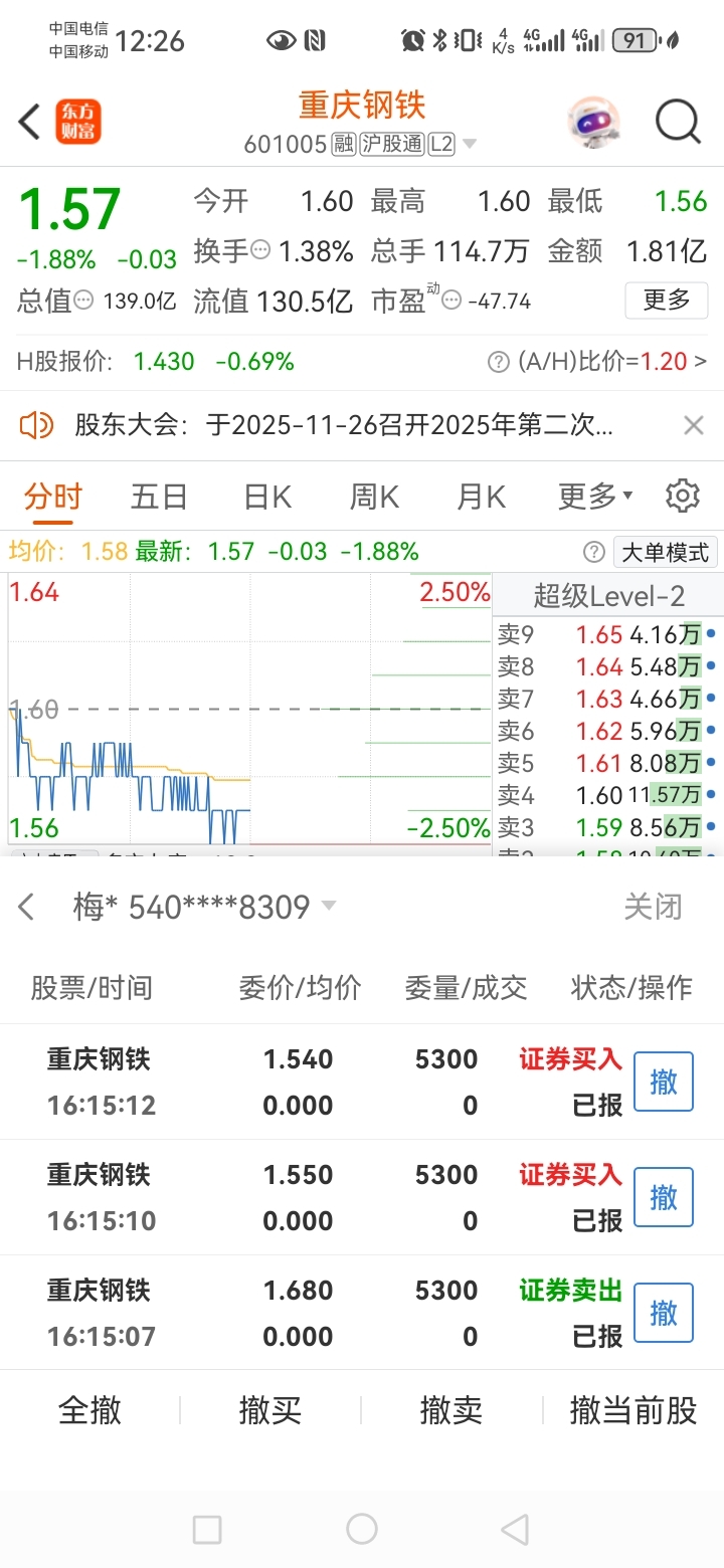 $重庆钢铁(SH601005)$ 兄弟们,不要慌,我在1.55和1.54布置了重兵。