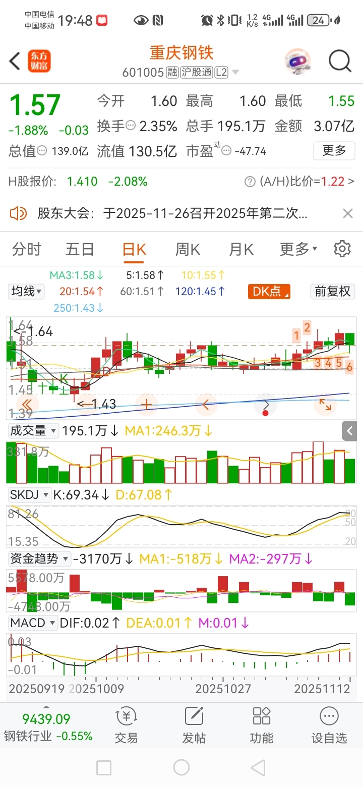 $重庆钢铁(SH601005)$ 上涨9转,今天第6转,一年也只出现两三次,把握住一两次就行。