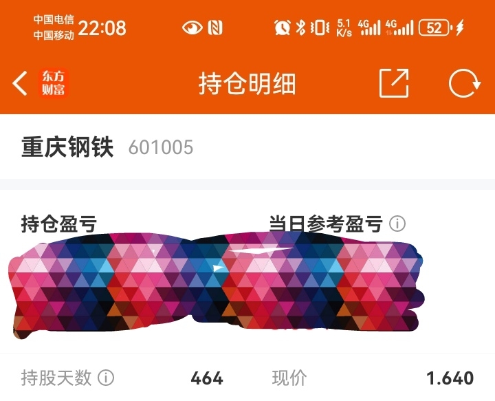 $重庆钢铁(SH601005)$ 持有464天,股吧前段时间受安徽黑猫这位大神影响,依旧重仓持有。炒股最忌讳听信网络神棍的影响,要坚定信念。