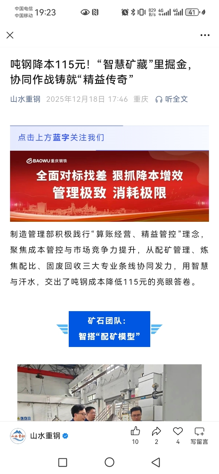 重磅利好!重钢每吨钢降本115元,预计2025年降本800万吨×115=9.2亿