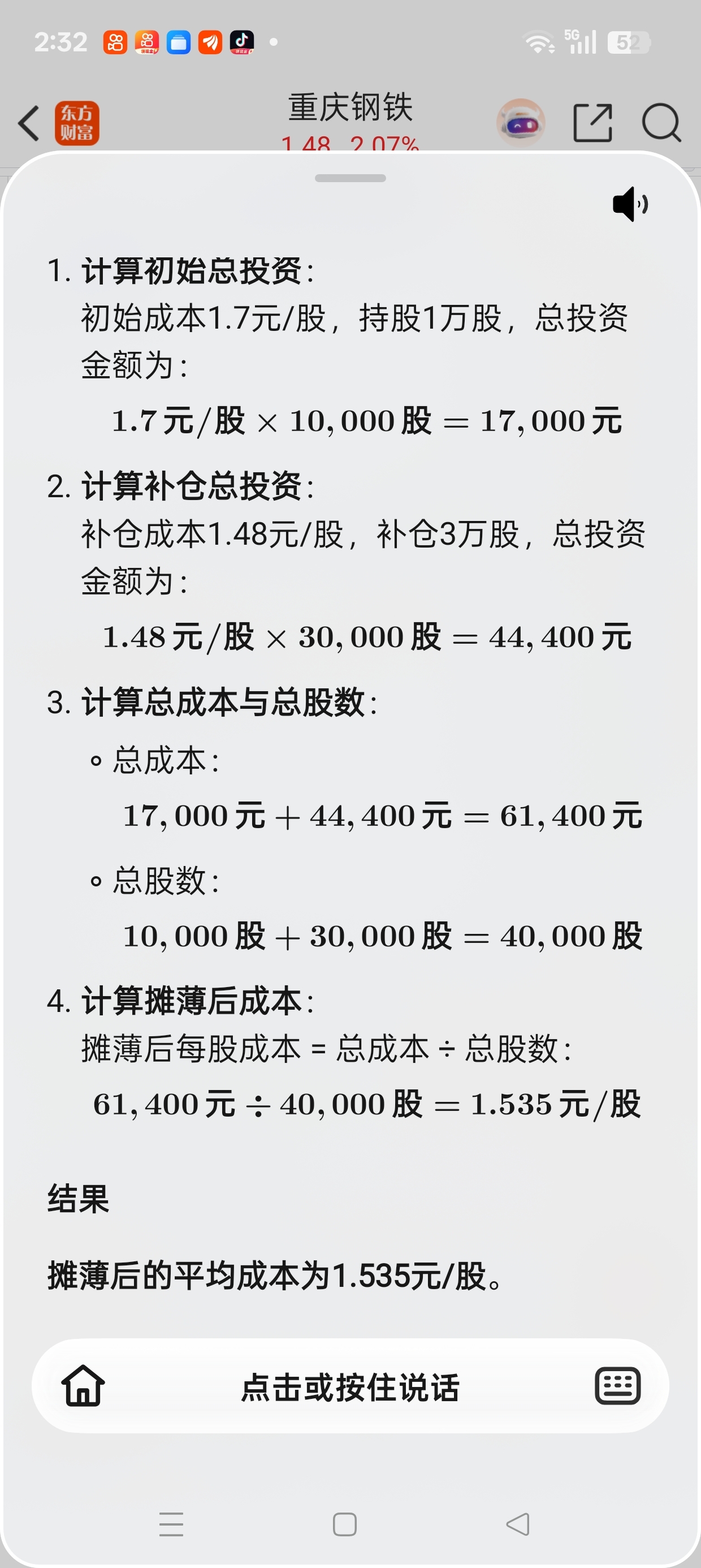 $重庆钢铁(SH601005)$ 来来来,兄弟们,给你们出一个方案,在高位1.7的补仓一下成本就下来了,涨几分钱就能解套?
