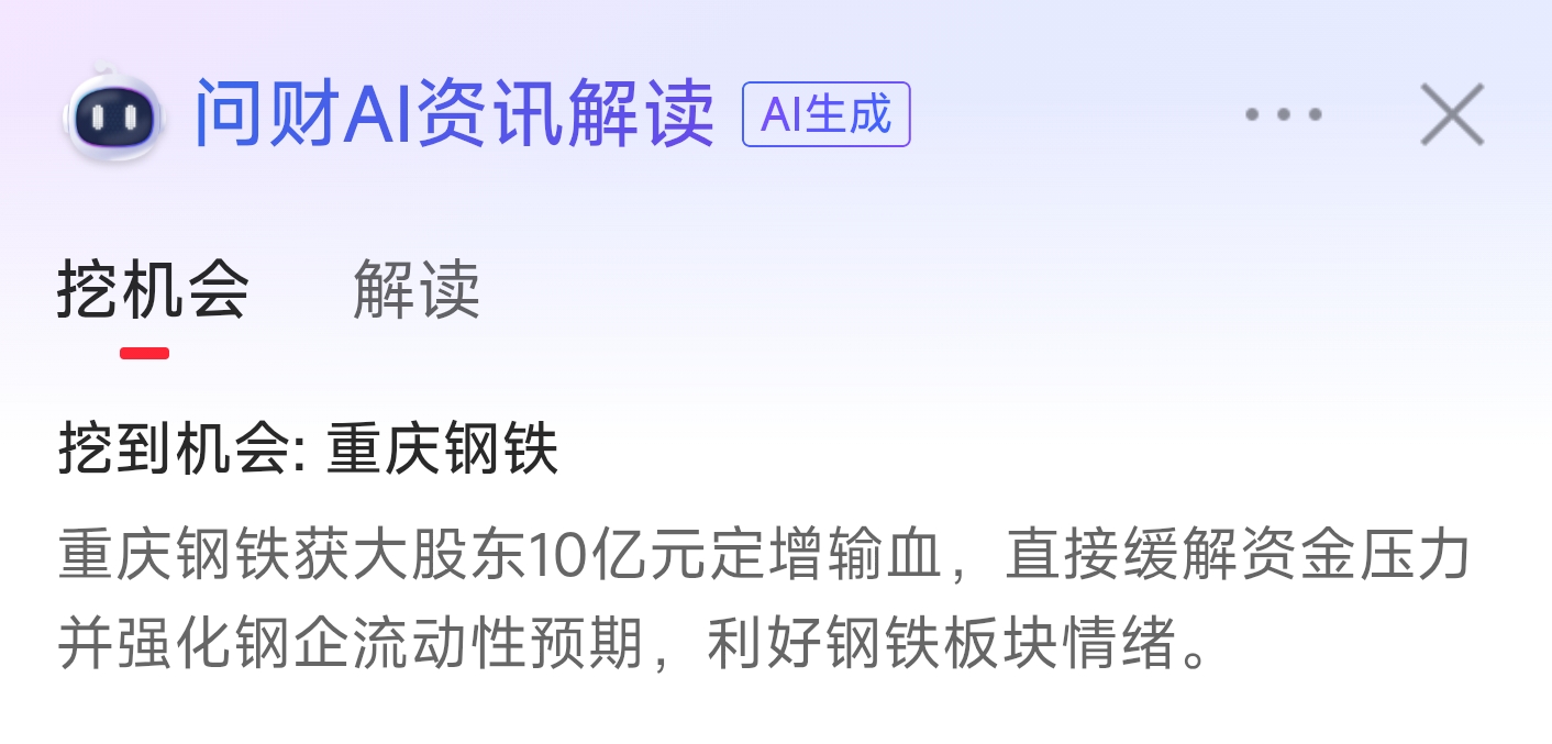问财AI资讯解读AI生成...X挖机会解读挖到机会:重庆钢铁重庆钢铁获大股东10