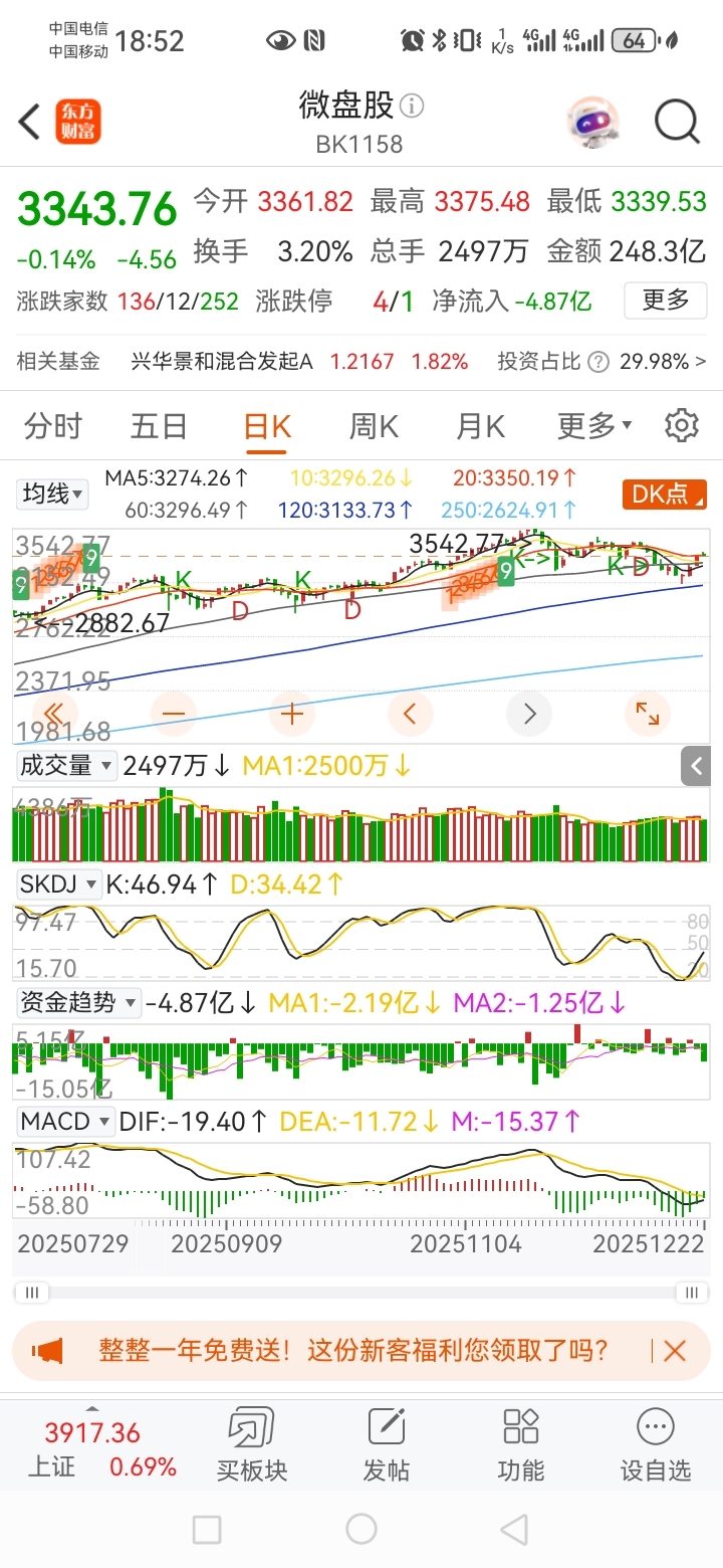今天微盘股率先出现调整,六大行沿着五日线攀升,买入六大行对冲。