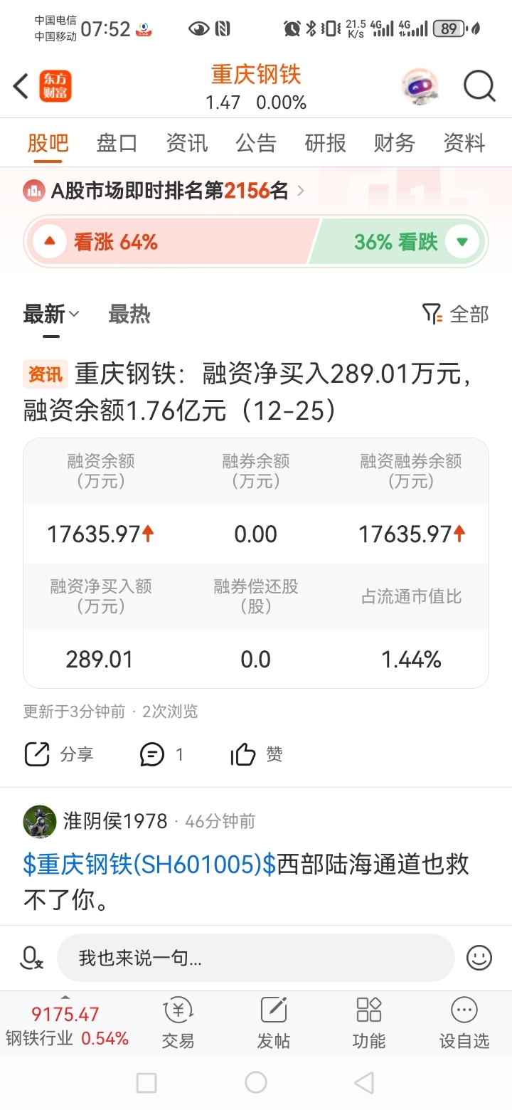 $重庆钢铁(SH601005)$ 重钢里面融资盘就是韭菜,大盘高位融资买入,大盘调整几天又是融资割肉。今天我继续减仓。