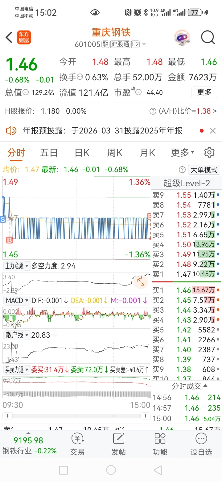 $重庆钢铁(SH601005)$ 尾盘加了一点